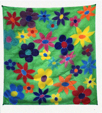 scarf is pinned to white board....by noting the dots projected onto white board, you can see how the process of posting scarf on web site at 72 dpi adds dots to scarf as well.....