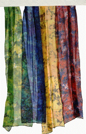scarves are hanging on a white board....dots on white board reveal the amount of dots web processing adds to scarves as well...