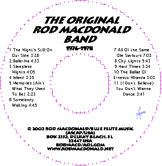 The full band debuted in January 1977 at Folk City in Greenwich Village, where I had played solo and with David and different musicians for several months. The band quickly became one of the Village's most popular acts, playing several weeks (Wednesday-Sunday) at Folk City in 1977, plus numerous other clubs and concerts in New York City. A "top 30" poll of Folk City staff and regulars named "Ballerina" their #1 song, with "Saviours" at #7, and we received excellent reviews in the Village Voice and Soho News. During this time I was working with John Hammond at Columbia Records on a recording contract, which fell through when John had health problems and retired. The group disbanded in 1978. With the exception of "You Don't Wanna Dance", which was released as a 45 rpm by Stash Records in 1980, these recordings were never published except for a few cassette demos in the 1970s. These tapes have remained in storage since that time, and were recently re-mastered for this project. Thanks to Mark Dann for his recording work, and to my father, H.O. MacDonald, for his help in recovering these tapes of one of my very favorite bands. |